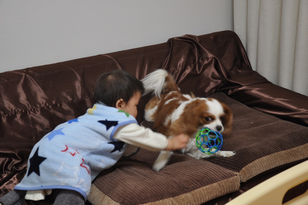ボール取り合いっこ 息子のお気に入りボール。いつもは隣の部屋かサークル内で遊んでいるが、今日はリビングでボール遊び。案の定、ボールが大好きな小春が横取り。息子も負けじと取り返す。最後はソファーのうえで、ボールの取り合い。なんか、癒されるな・・・